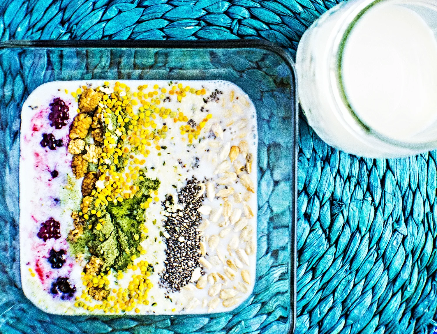 - This can also be assembled in a jar with non dairy milk and left to "bloom" overnight you will have a thicker cereal for the next morning. Get creative and use your favorite nut/fruit/superfood combos.
